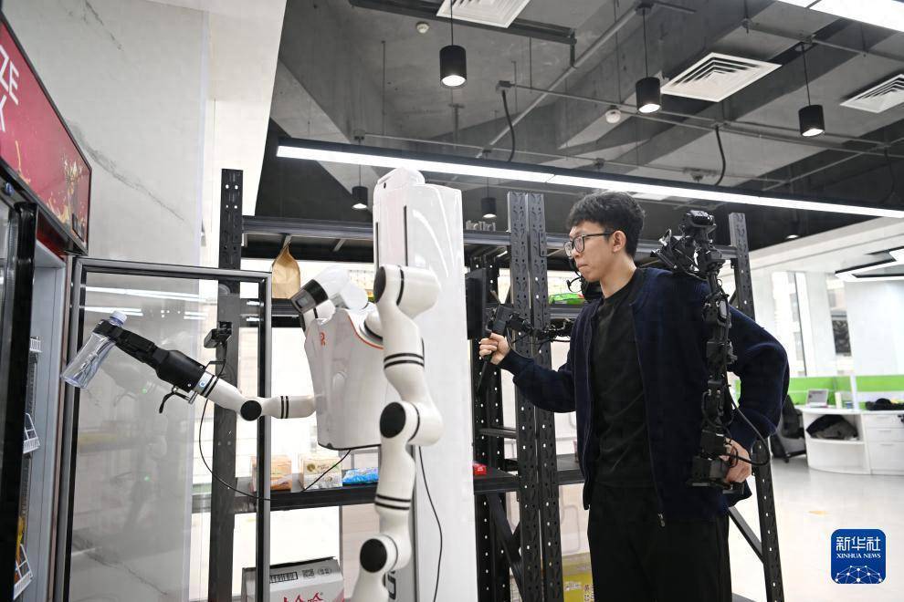 3月17日,在中国雄安集团数字城市科技有限公司具身智能训练场,工作人员采集机器人训练数据。