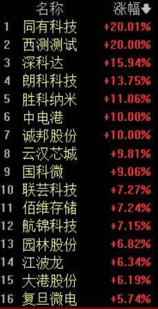 早盘,存储芯片板块爆发,板块内同有科技、西测测试2股20CM涨停,深科达、朗科科技、胜科纳米涨超10%,中电港、城邦股份涨停,云汉芯城、国科微涨超9%,联芸科技、佰维存储、航锦科技等涨超7%,园林股份、江波龙、大港股份、复旦微电涨超5%。